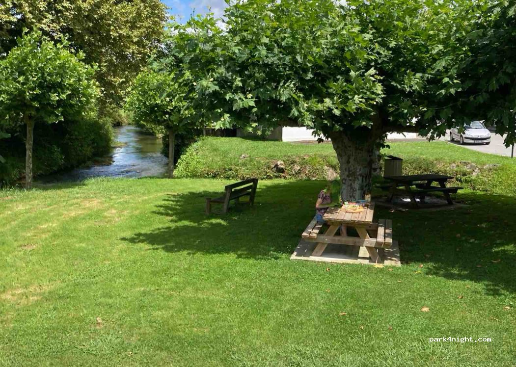 idéal pour pique niquer, aire de jeux pour les enfants à côté, petit ruisseau qui coule, à l'ombre, très agréable ! je ne vois pas comment on peut y dormir sauf petit véhicule et encore.