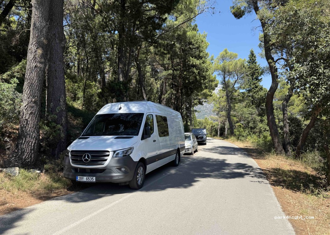 perfecto para visitar korkula, accesible en 5-10min por una calle de escaleras. vistas espectaculares. por la noche tranquilo. pasó la policía y no nos dijo nada. tampoco hay ninguna señal que prohiba estacionar intentad mantener perfil bajo y no llamar la atención. no se os ocurra sacar sillas y demás, luego nos cierran los sitios para dormir.