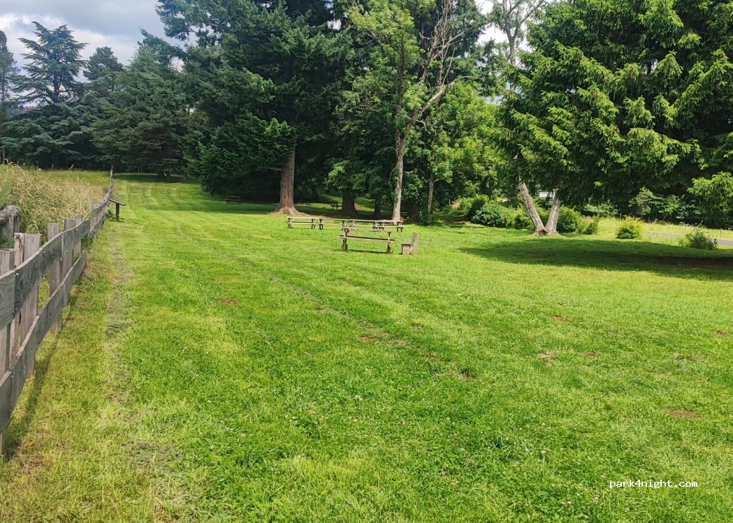 Large Picnic Area with grass and tables next to the Chateau de Montlosier.