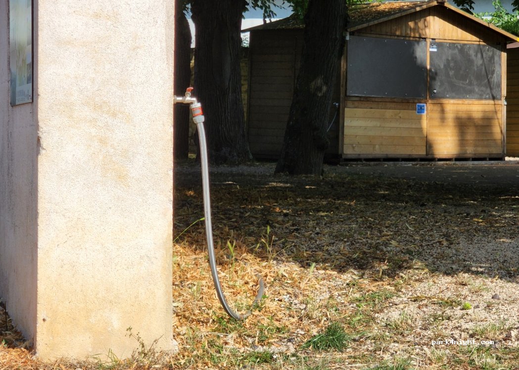 Parking devant le parc. Robinet d'eau, belles toilettes propres, aire de jeux pour enfants, tables