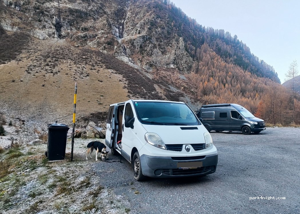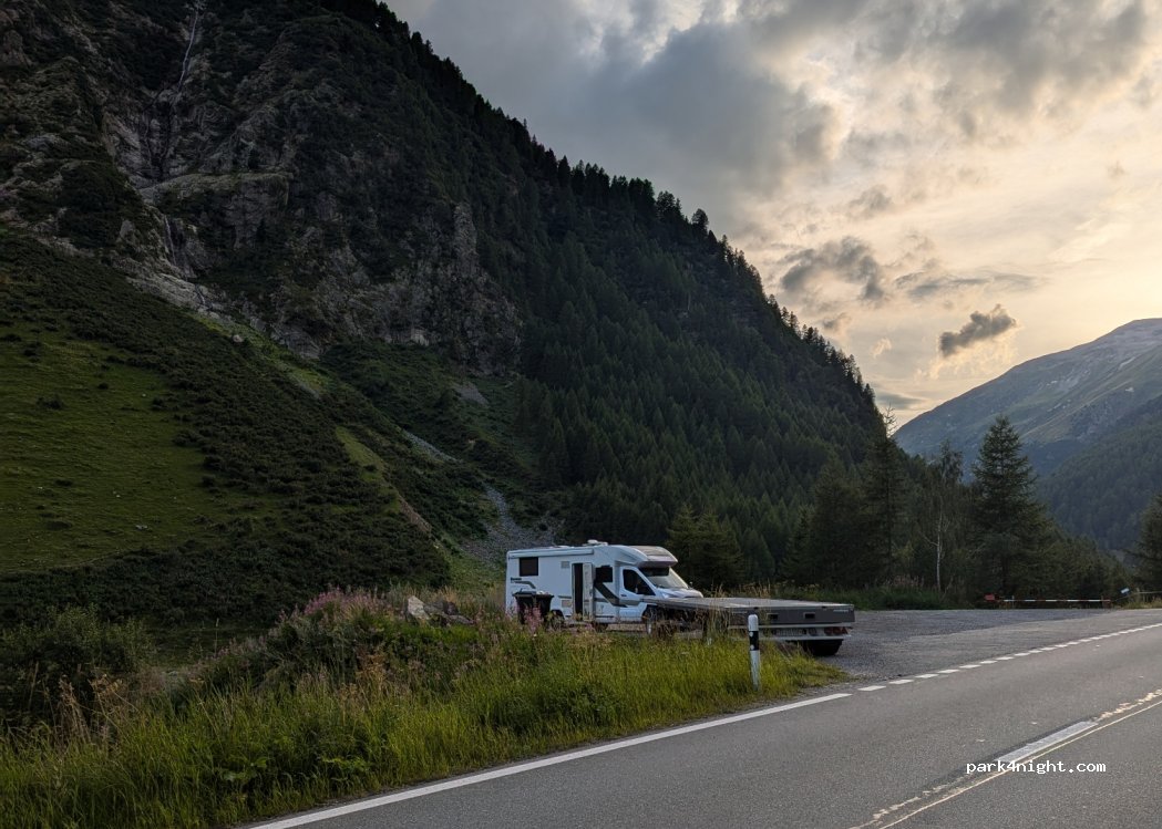 Parking lot at the Flüela Pass with moderate traffic at night. Right by the Inn, so you can wash yourself. Also wonderful for doing yoga right by the river. We stayed here undisturbed for 2 nights! No parking fees.