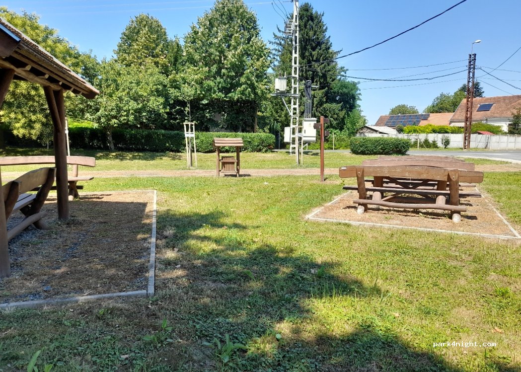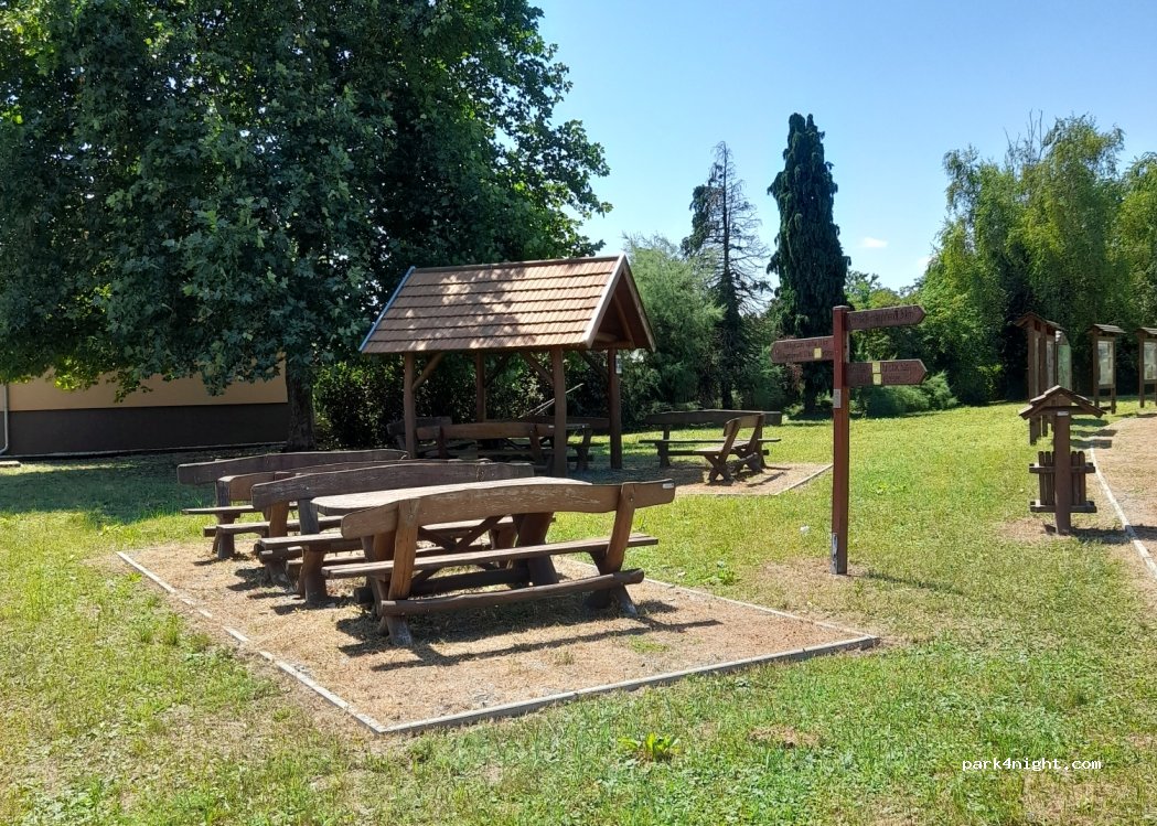 Picknickplatz am Ortseingang mit drei großen Tischen, einer davon überdacht. Es gibt einen Mülleimer. Kein ausgewiesener Parkplatz.