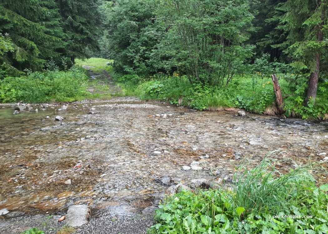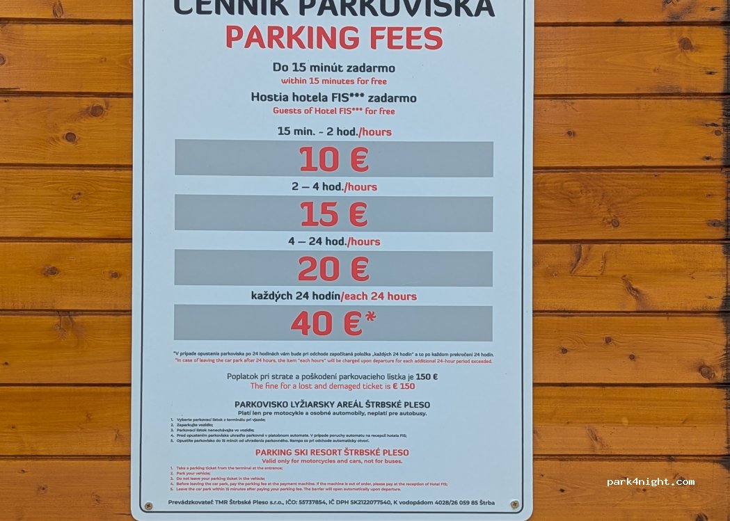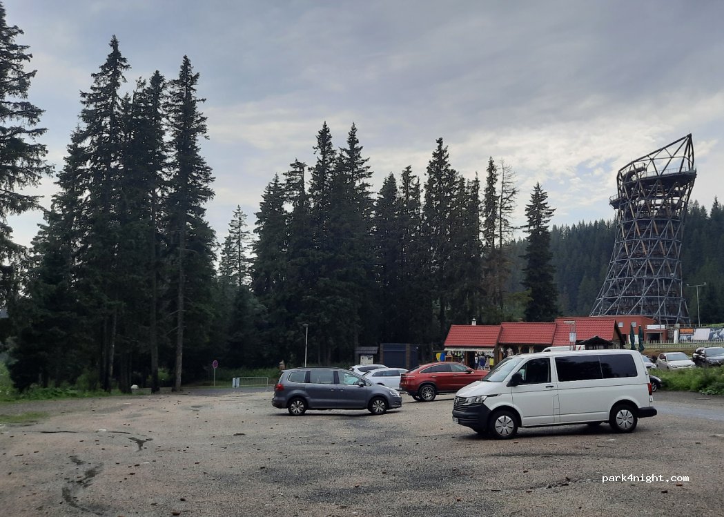 Hotel parking lot. For a fee, camper vans can stay here overnight. Great starting point for hikes to Strbske Pleso or the cable car to Predne Solisko. Very quiet at night, beautiful location by the river.