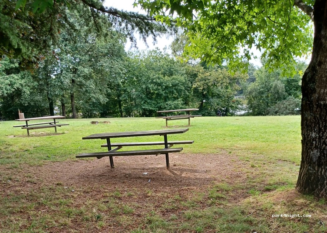 Etang d’Aumée (which looks more like a small lake than a pond.) supervised swimming. dogs prohibited on the small beach but plenty of space around for them. walk or bike ride. small tarmac car park and several large car parks (grass) after the first car park, not very flat but you can find almost flat places at the top of car park number two or at the bottom of car park 3. large children's play area. pétanque court, barbecue area and trash cans near the picnic tables. No sign prohibiting motorhomes at night. public toilets but.... given the smell and no paper we preferred the ones in our camper van... very relaxing place