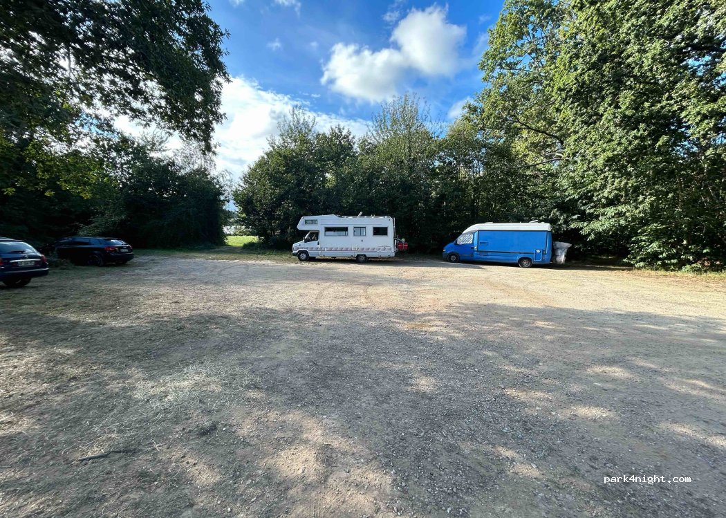Beaucoup d’espace, accessible facilement en poids lourd. Étang à 1mn à pied, le parking est légèrement en pente.