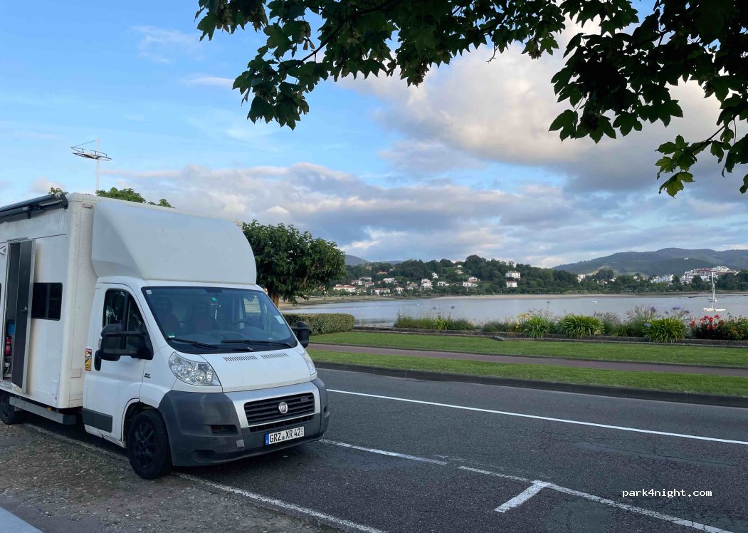 Places en bord de route à cheval sur le trottoir (assez larges), route légèrement passante, avions en journée. Penser à payer à l’horodateur ! Près de la grande plage d’Hendaye à pied, centre-ville à 25’ de marche par la promenade aménagée le long de la baie. Belle vue, mais je pense que les véhicules hauts gênent quand les maisons sont habitées (places devant les habitations).