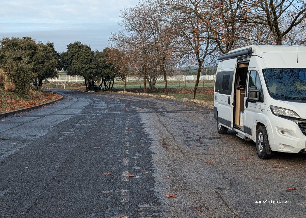 Petit parking ombragé en contre bas d'un skate park et du gymnase. table de pique nique. bruit de fond continu au loin de la route qu'on oublie très vite. parfait pour une nuit.