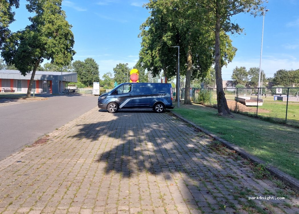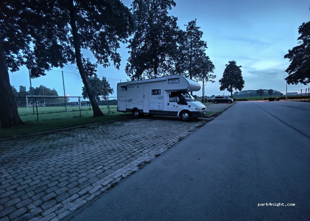 Parking d'un centre sportif. Pas de limitation en hauteur, très calme la nuit mais comme il y a un stade les tondeuses passent vers 7h. Il y a des toilettes chimiques. Nous avons passé une nuit avec un camping-car de 7m