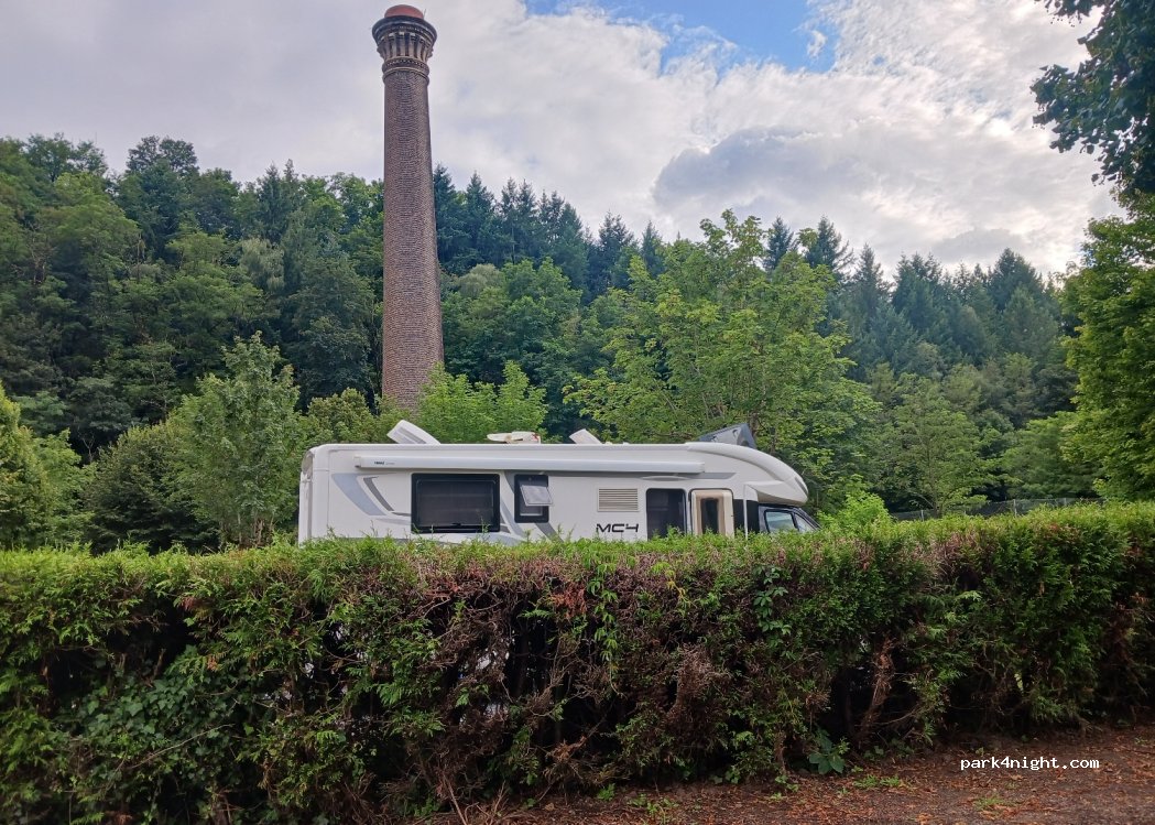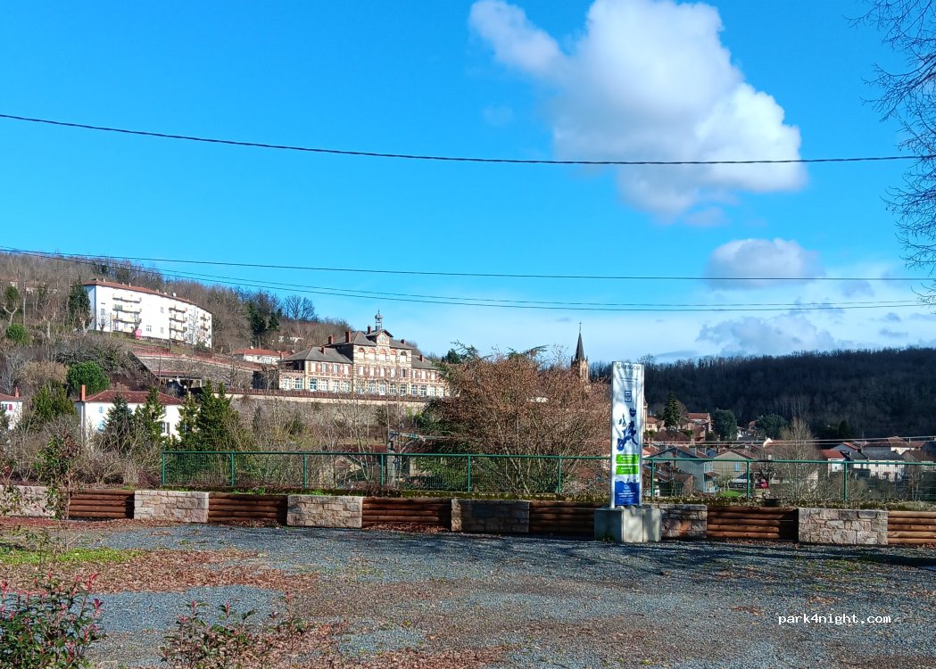 Une jolie halte avec places aménagées sur les hauteurs du village, village que l’on peut rejoindre à pieds par un cheminement à droite en sortant vers les bâtiments municipaux et l’Intermarché le lac est lui aussi accessible par un chemin praticable par temps sec. Prix sympa merci la commune.