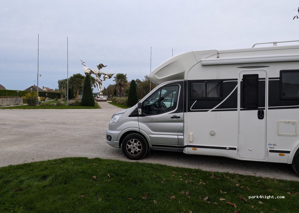 A nice quiet place to park up for the night on the outskirts of Grandcamp Maisy. The sculpture makes it easy to find. No issues, and we were the only van there.
