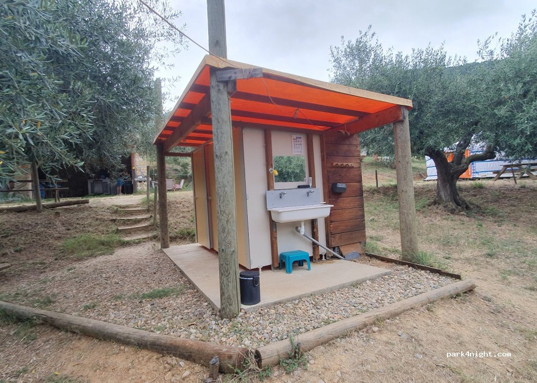 Camping naturel avec quelques hébergements insolites Une très jolie salle commune avec une cuisine très bien équipée Nous avons pu y dîner le soir à l'abri de l'humidité Sanitaires simples et propres Terrain pour van en pente mais il y a des cales à disposition Accueil très sympathique de la propriétaire