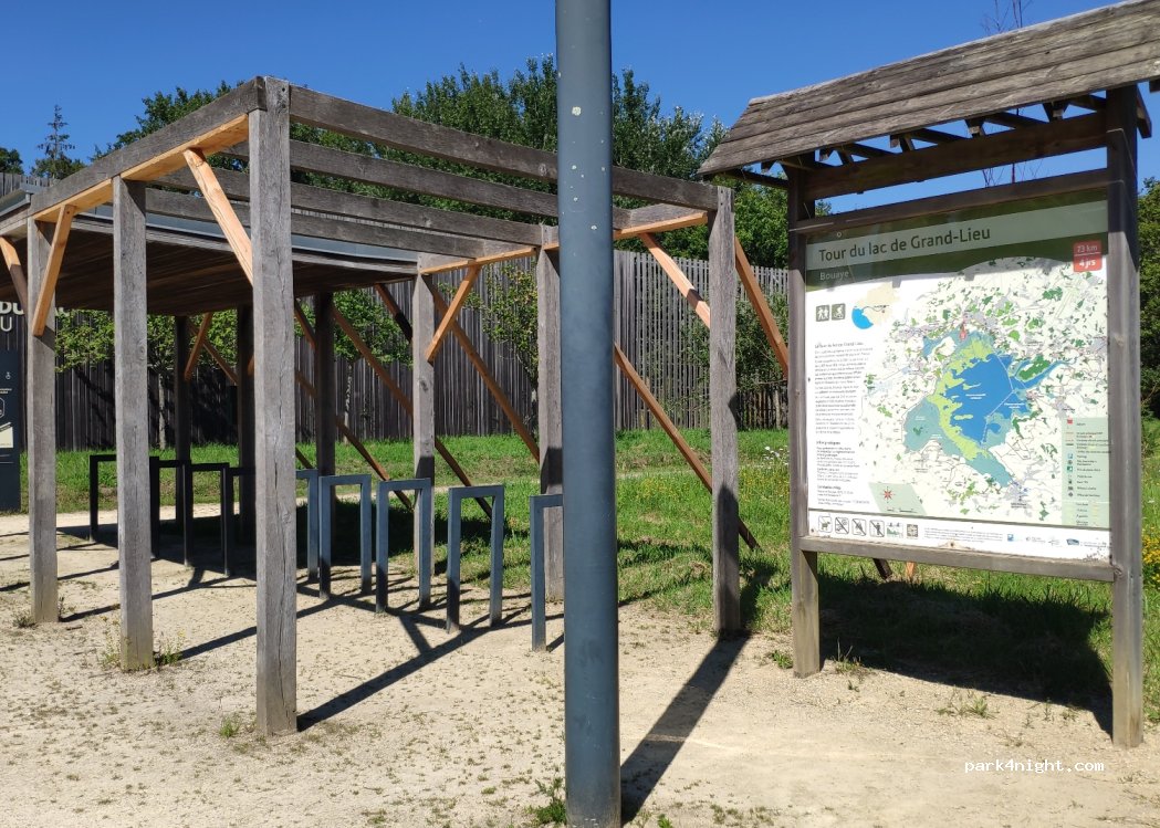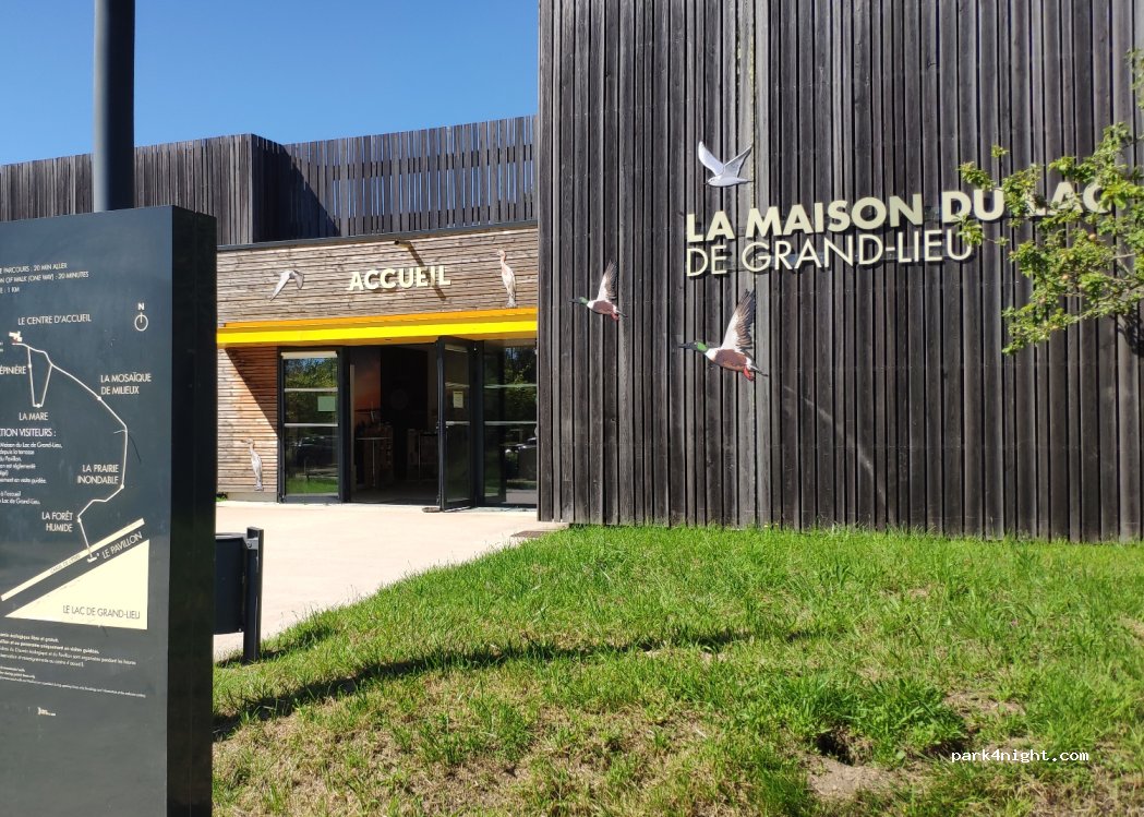 Parking jour,possible pour camping car longueur 7 mètres maximum,la maison du lac de grand lieu, visite payante 3€ et 8€ environ...et promenade possible, petit coin nature très agréable....
