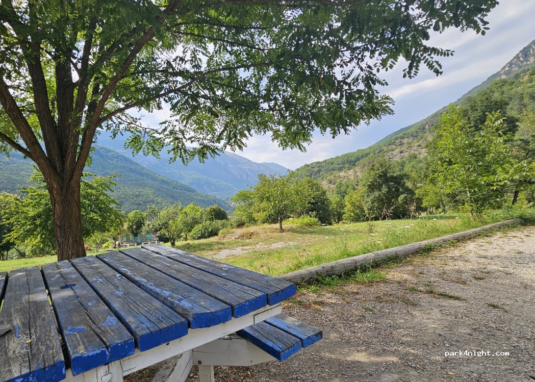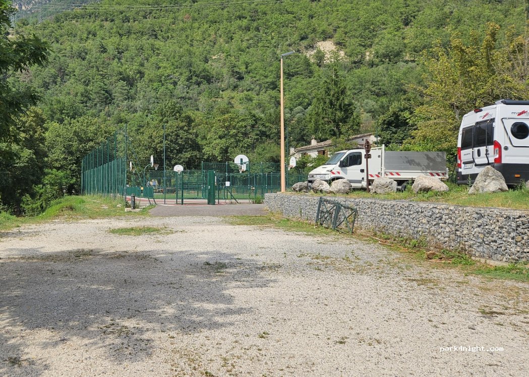 Parking in Roussillon, few minutes away from M2205, in a village, quiet, calm, near basketball playgroud, drinking water, place to eat in shadow of tree. No signs of prohibition for campers, probably possible stay overnight.