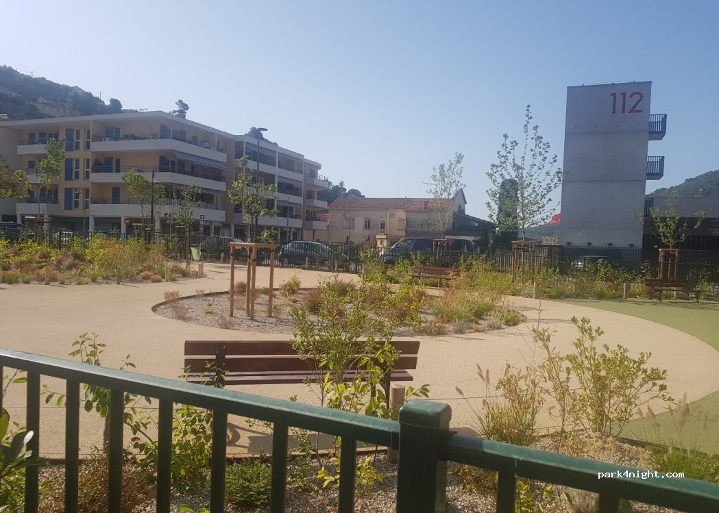 Quelques places le long de la route près du terrain de jeux. pas très adaptées mais l'avantage c'est la gare qui est a 400m à pied et qui permet de rejoindre Nice en 45mn . Carte de transport au bureau de tabac en face de la gare chargé avec les trajets .Au terminal, vous trouverez le tramway station Libération, arrêt opéra ou celui d'avant pour allez vers la vieille ville