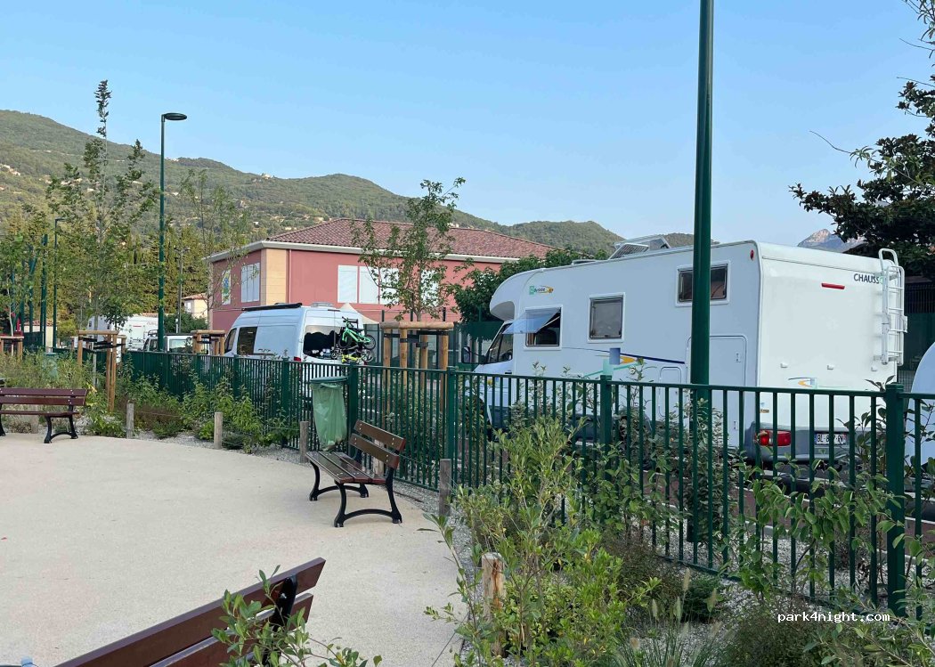 Le seul endroit que j'ai trouvé pendant 2 semaines dans la région qui a marché pour moi. Négatives: près de l'école et le terrain a jeux donc bruyant jusqu'àu crépuscule. La nuit tranquille. Positives: bus numéro 59 de La Place fréquemment vers Cadam (Nice centre administrative) où on peut basculer vers le tram direct Nice. Le seul lieu pour vidanger est 26km aug nord ....