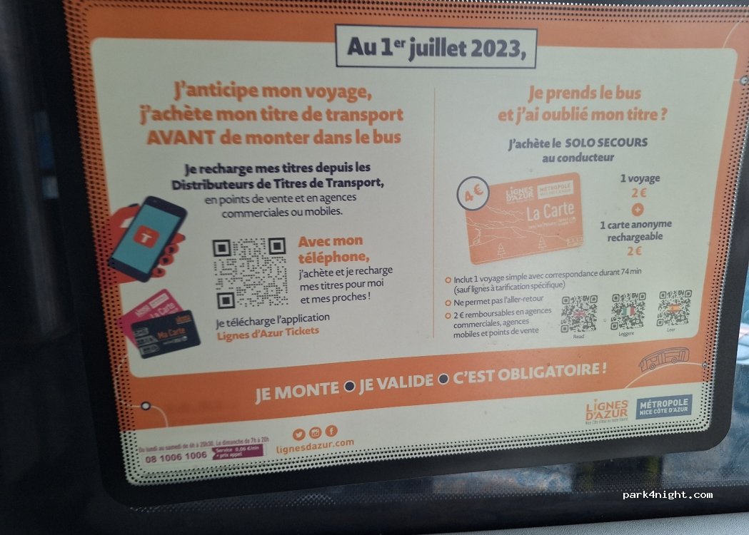 Guter Platz für einen Nizza Besuch. Am besten mit der Buslinie 59 vom Hauptplatz bis zur Station St. Insidor oder Les Arboras und dort in die Straßenbahn Nr 3 umsteigen. Zentrum etwa bei der Station Jean Médecin. Ticketkarte kann im Bus direkt gekauft werden. Eine Fahrt (einmal entwerten) gilt für 74 Minuten. Aufladen kann man die Ticketkarte bei jeder Straßenbahn Haltestelle.