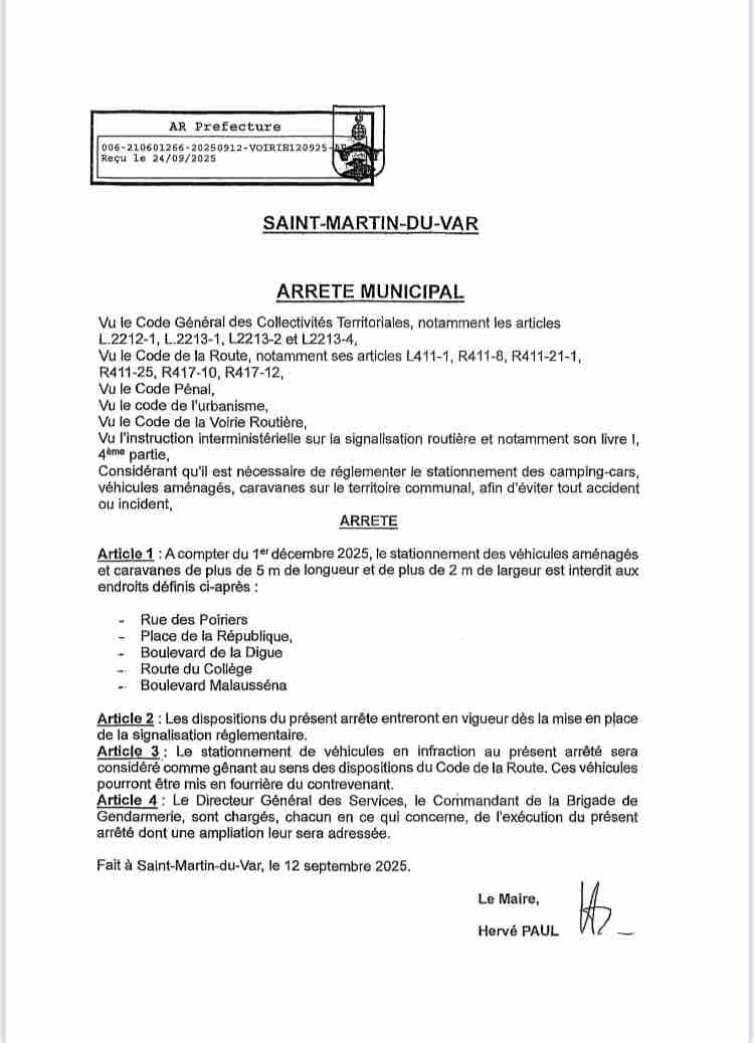 Attention ! À partir du 1er décembre 2025, le stationnement sera interdit aux véhicules de + de 5 m de long (qui prennent deux places de parking). Voir Arrêté Municipal, photo ci-joint.