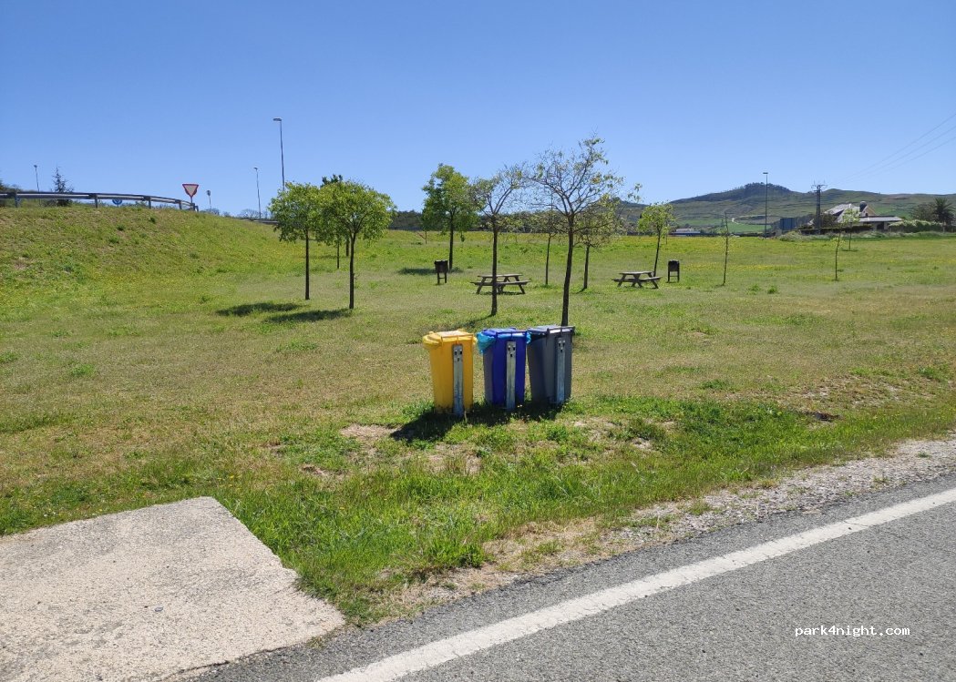 Una de las pocas zonas de descanso de la A-12, de fácil acceso en ambos sentidos. Ni una sola sombra. Se proporcionan mesas de picnic y botes de basura.