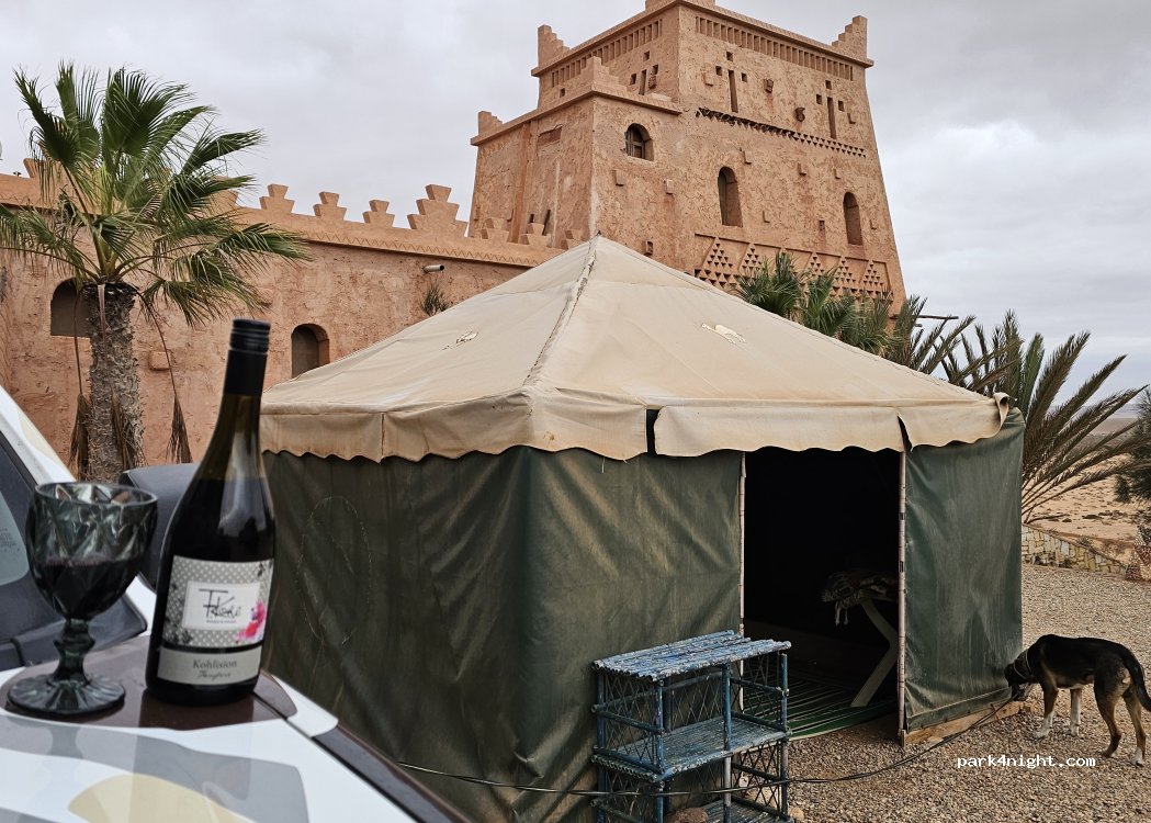 Die Zufahrt mit Bodenfreiheit und etwas Schwung auch für 4x2 möglich. Wir sind gegen 18:00 angekommen haben uns eingerichtet und wurden gegen 21:00 von dem anlaufenden Strom Generator wieder geweckt. Gegen 22:00 haben wir dann diesen unruhigen Ort wieder verlassen. Wem also eventueller Motorenlärm in der Nacht nicht stört, hat ihr einen schönen Stellplatz. Preis aktuell 60DH pro Person.