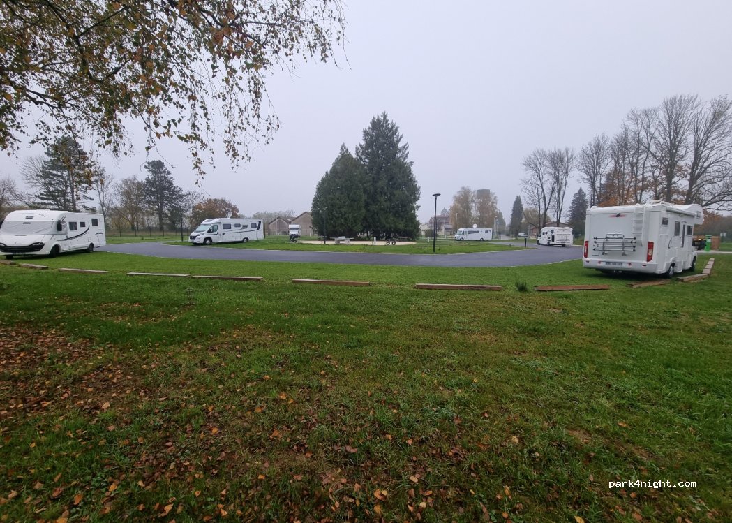 Très belle aire, grands emplacements avec herbe et table de pic-nique, avec tous les services. Intermarché à proximité, excellente pizzeria et distributeur de pizzas de l'autre côté de la rue. Seul inconvénient, envahissement des pucerons et moucherons, compliqué de manger dehors le midi. Peut-être était ce dû à la météo (pluie et soleil) mais fort désagrément. Très joli village