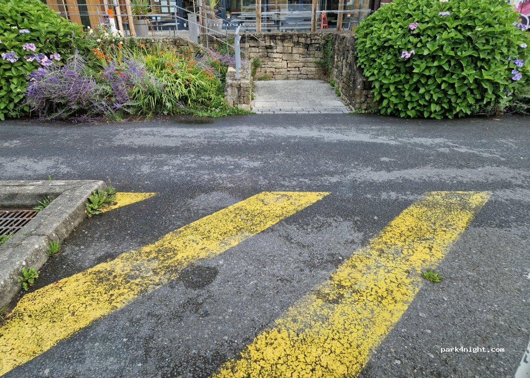 Parking lot surrounded by shops/restaurants. Not pretty, but functional. Toilet opens at 9:00 (July 2024). Public wifi from the fast food chain with good connection. A snack shop opens at 9:00 with good coffee.