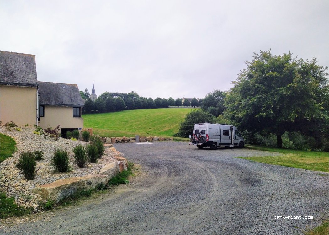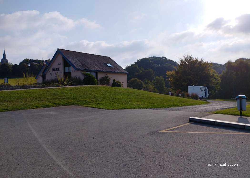 Petite aire accessible à tous les gabarits située en contrebas, juste derrière la Mairie. Services gratuits mais peu pratiques d'accès si le stationnement est complet. Sans enthousiasme pour cette récente création mal agencée, nous avons préféré aller à Plessala, 19 km au sud, sur une aire champêtre entourée de verdure au bord d'un étang.