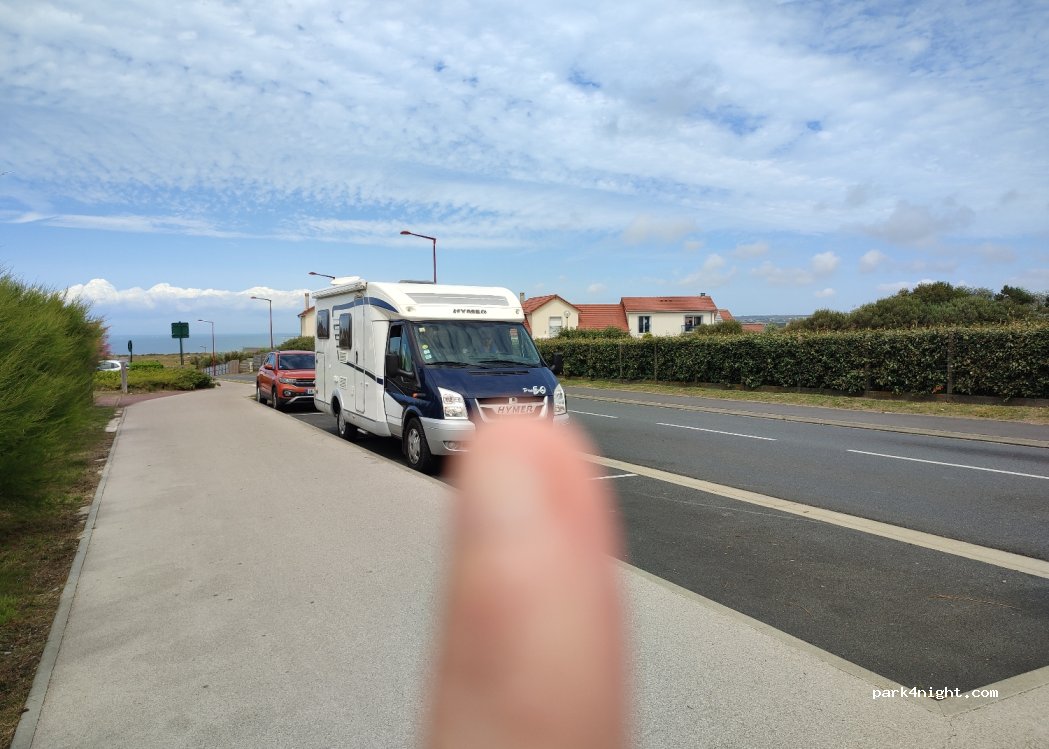 Two free parking spaces on the roadside at the entrance to Wimereux. 2 x 3 car spaces in a row which allow you to park a large camper van if everything is free. slightly sloping.