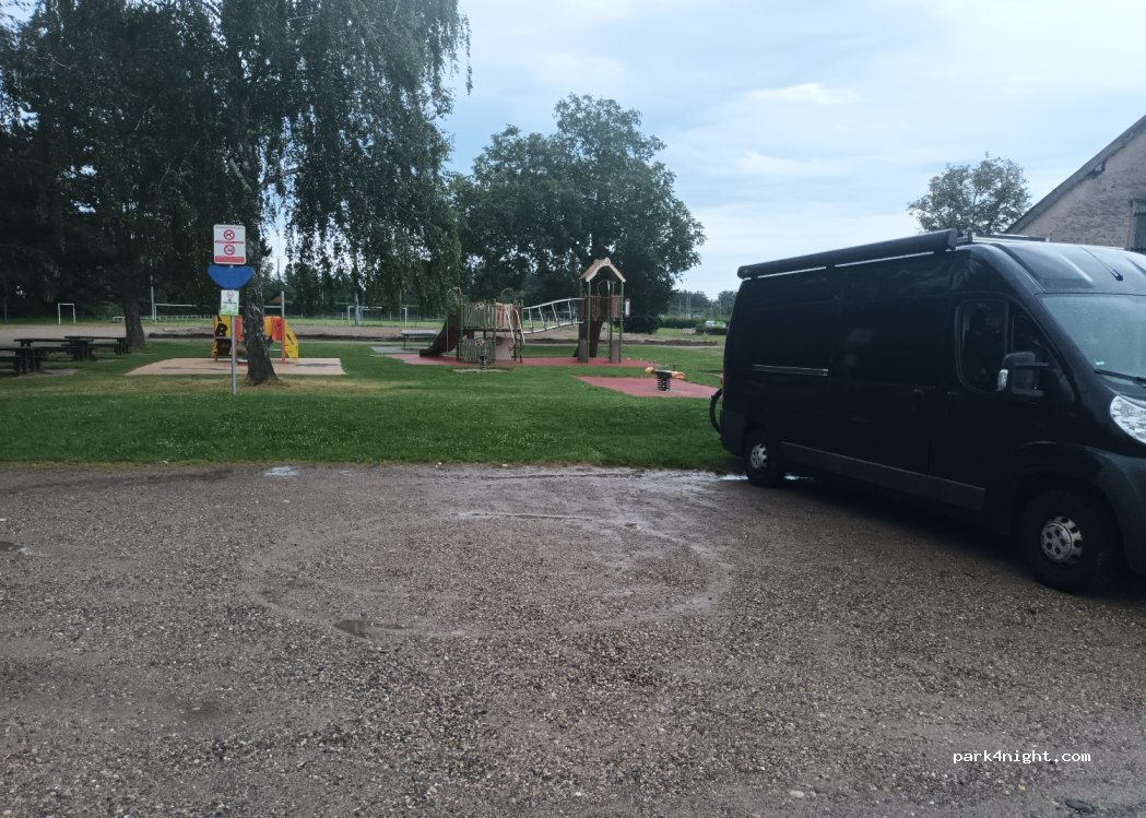 Parking avec tables de pique-nique et aire de jeux, aucun panneau d'interdiction. Toilettes publiques très proches du club de rugby, pas particulièrement propres.
