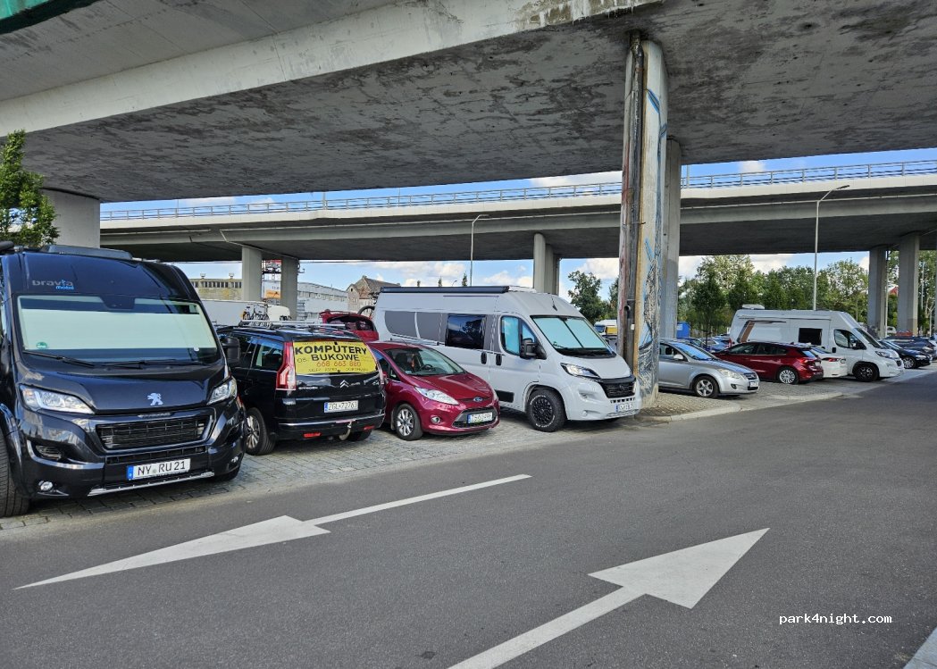 Parken unter der Autobahnbrücke mit recht großen Stellplätzen (maximal 6 Meter) und zentrumsnah. Aufgrund des Straßenlärms nicht zum Schlafen empfohlen, es gibt jedoch kein Verbotsschild.