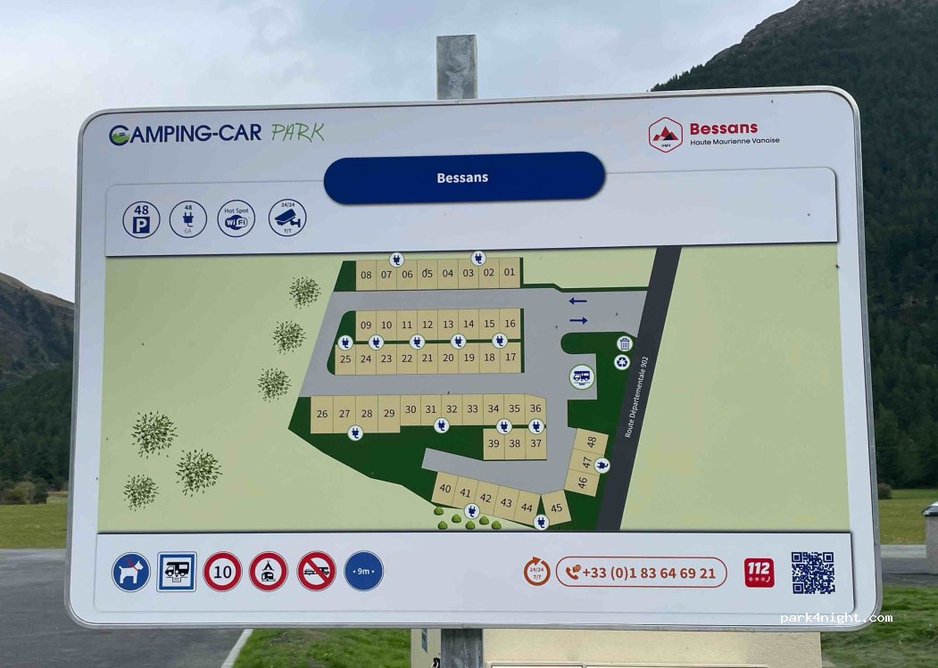 l aire est pleine mais pas de services :ni électricité qui coupent sans cesse, ni wifi, et ce matin pas d eau! ça fait chère pour une place de parking... Bessans reste une très belle station pour le ski nordique, dommage que l aire ne soit pas au niveau
