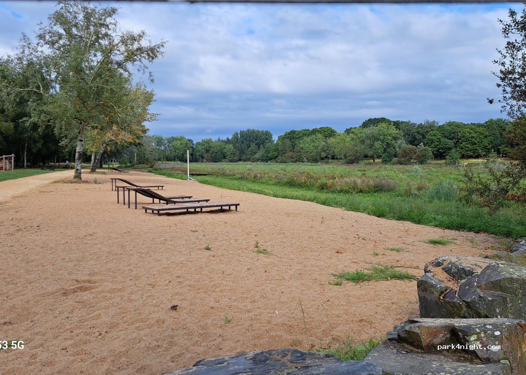 spot super calme, place pour plusieurs vans, un parking gratuit pour les cc, jolie promenade autour d'un ancien étang, un petit restau ouvert de 8h30 à 16h, aménagement de jeux pour les plus jeunes, et pour les grands des espaces détente. Toilette public propre. Peu de passage le soir. Lieu propre et entretenu.