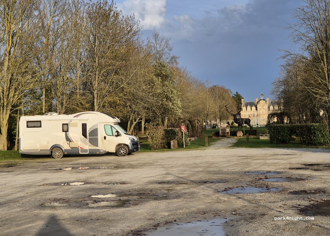 Gravelled square with a view of Beaumesnil castle, free and flat. Good for a stopover, shops: butchery (excellent), bakery, grocery store.