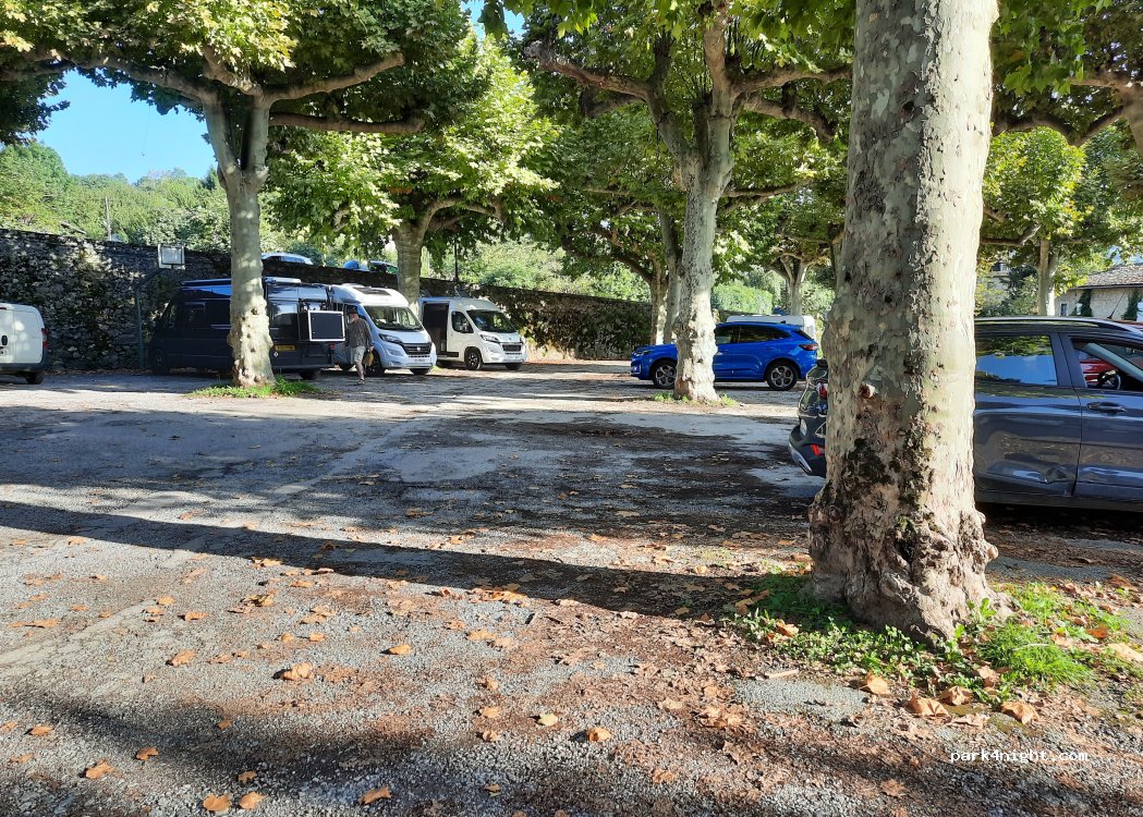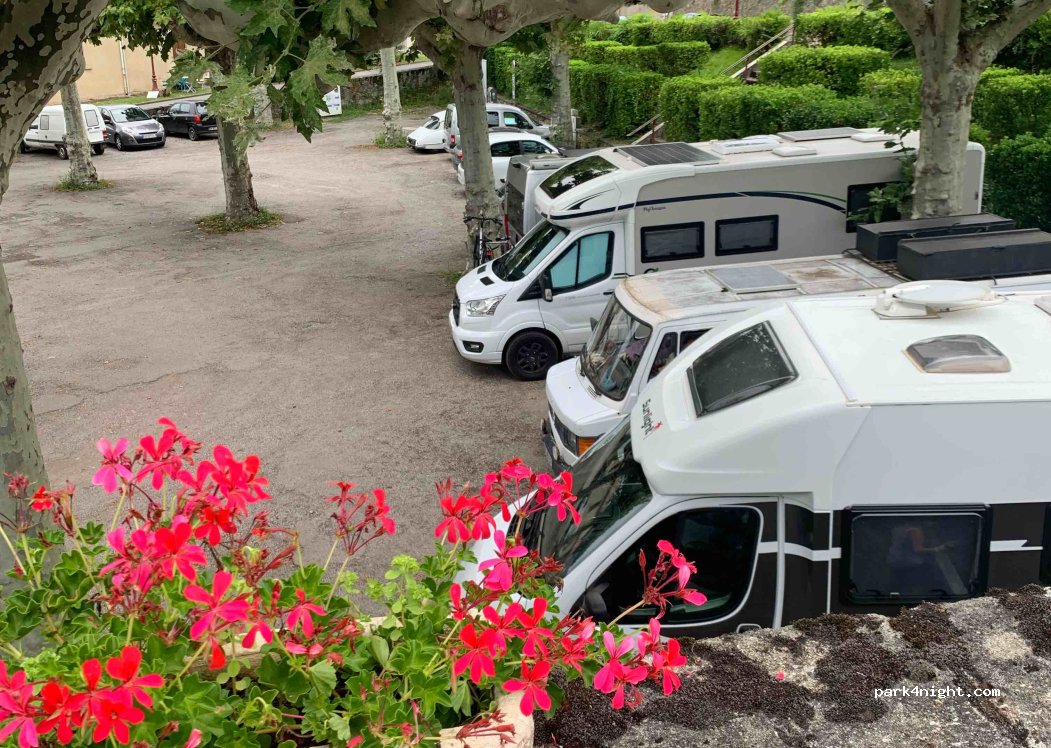 Un bon point à la municipalité qui laisse ce parking pour tout véhicule 48h. Plat, ombragé, belle vue, petit marché paysan mercredi matin. pas de services, mais poubelles et un robinet. WC très propres à 30m.
