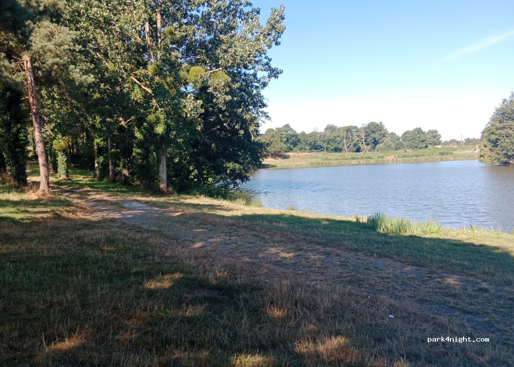 Quiet spot facing the lake, fishermen only during the day. Several picnic tables and different places to relax. We spent a very quiet night there, despite the road a little further away.