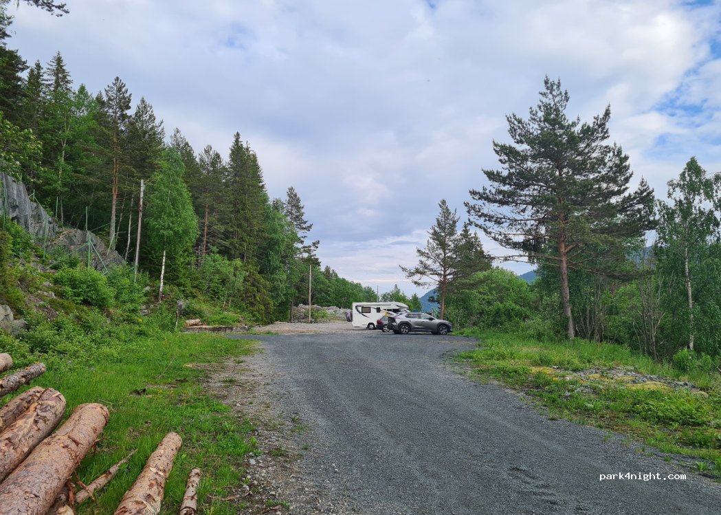 It is actually the starting parking of a hike which the tourist office promotes (topo on leaflet papers or pdf), but not many people in the week apparently. In gravel and away from the road. Some places for Van, attention the path is narrow, difficult to cross. Relatively flat. No special view of the car park, but the following hike offers some views of the fjord