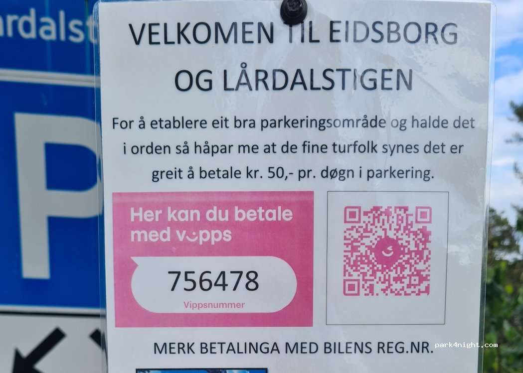 Parking lot of the Lårdalstigen (beautiful hike!) Hike from Dalen to Lårdal (14km one way). You can take the boat back to Dalen & walk up the road again. Peaceful place in the weekend. On Monday morning we woke up because people were working on something at the parking lot. Not sure how long that will take.