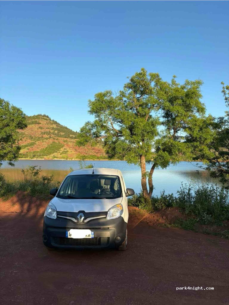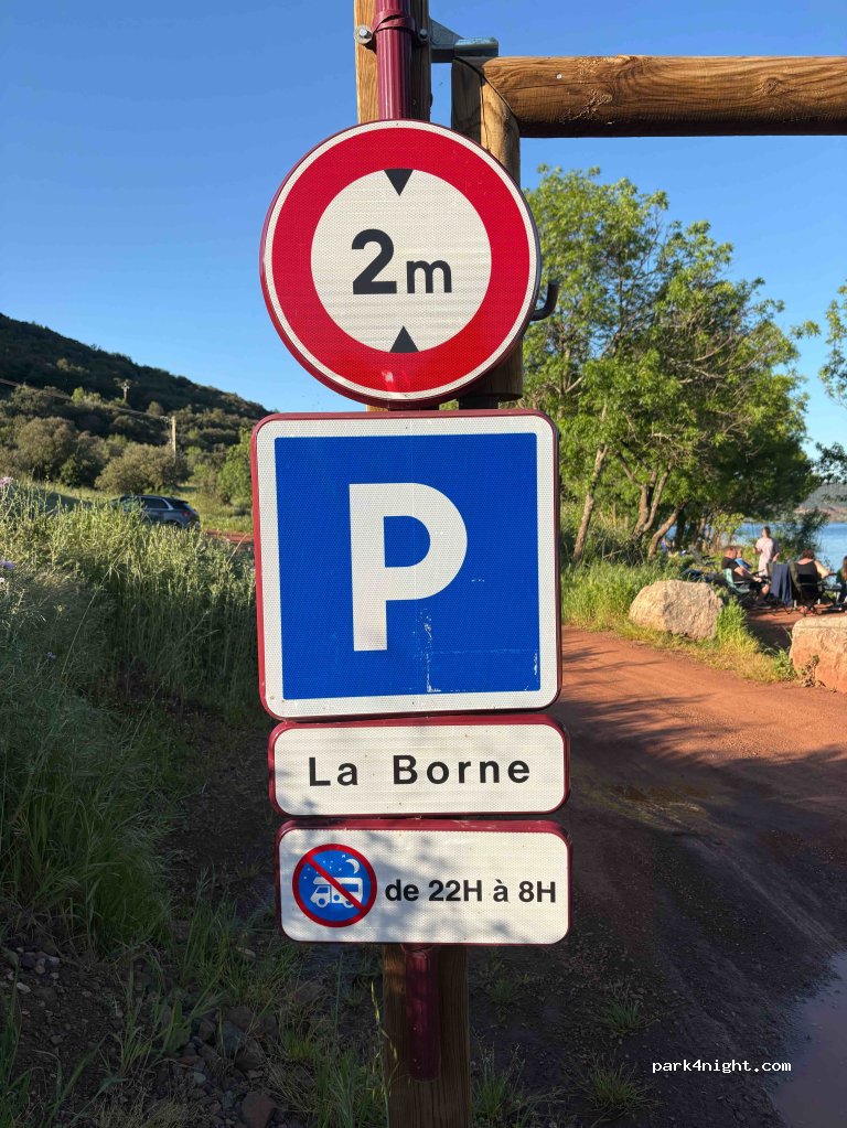 le parking cité a une barre de hauteur à 2 mètres, mais il y a une aire juste avant , bien plate, permettant de stationner jusqu'à 6 véhicules tout gabarit. Pas de panneau d'interdiction ou d'horaires sur celle-ci. La vue est très belle, le calme règne, hormis la route qui est audible (mais très peu de passage la nuit). il y a des petits sentiers boueux pour marcher autours du lac.