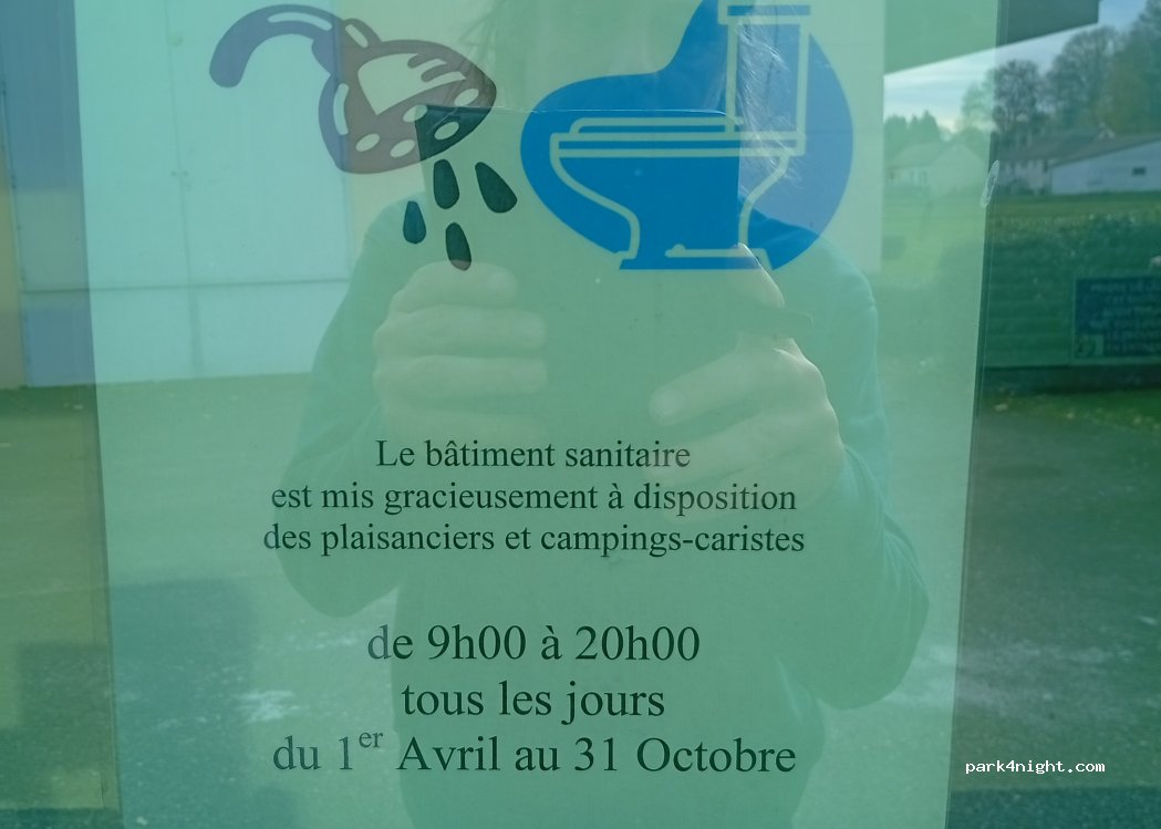 Parking max 48h, sur parking. Aire de jeux pour enfants. Pas d ELEC, mais EAU et VIDANGE gratuits. parking inaccessible les WE (Salle des Fetes). Pas de poubelles pour déchets ordinaires (seulement recyclé). Douches ok mais sales, avec porte serviette et raclette, ce serait mieux