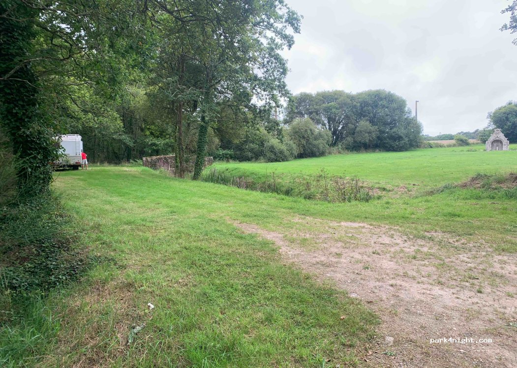 Emplacement vraiment jolie et calme. Proche d'un gîte, un peu de musique dans la soirée mais rien de méchant. Nuit calme. Proche d'une chapelle en pleine nature. Grand espace vert, pratique avec des enfants et un chien. Proche de Carnac et Auray. Possibilité de se garer le long de la petite route. Peu de passage car impasse les seuls voitures sont celles du gîte.