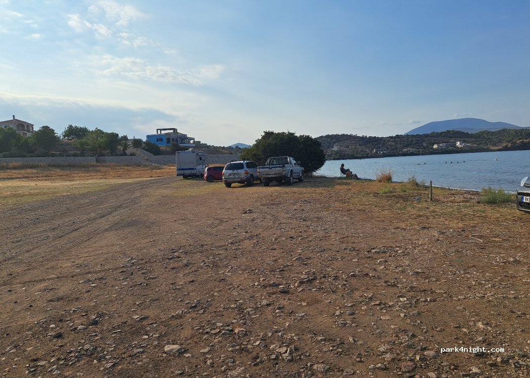 Parking directement sur la mer, petite plage étroite, parfait spot de baignade, quelques arbres dispos pour l'ombre, aucune interdiction apparente d'y rester pour la nuit