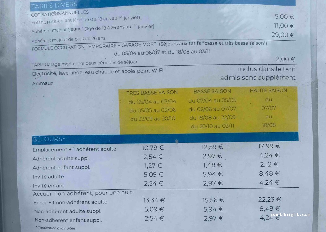 Terraced campsite on the hillside with a view of the nearby beach to the east. There is only a road in between - which is a little audible. The town of Saint-Cast-le-Guildo is within walking distance. The site is run by the GCU Association, with holidaymakers also running the site. Nonetheless, non-members are also welcome. Price applies to non-members (incl. vehicle and driver, additional adults plus €8.48)