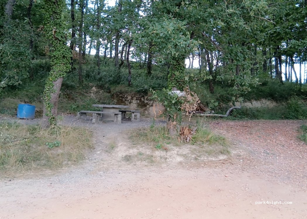 A little further than the previous one, at the end of the recently stoned path. Picnic table, trash can, trash can for glass. 2 places for van or 6m cc.