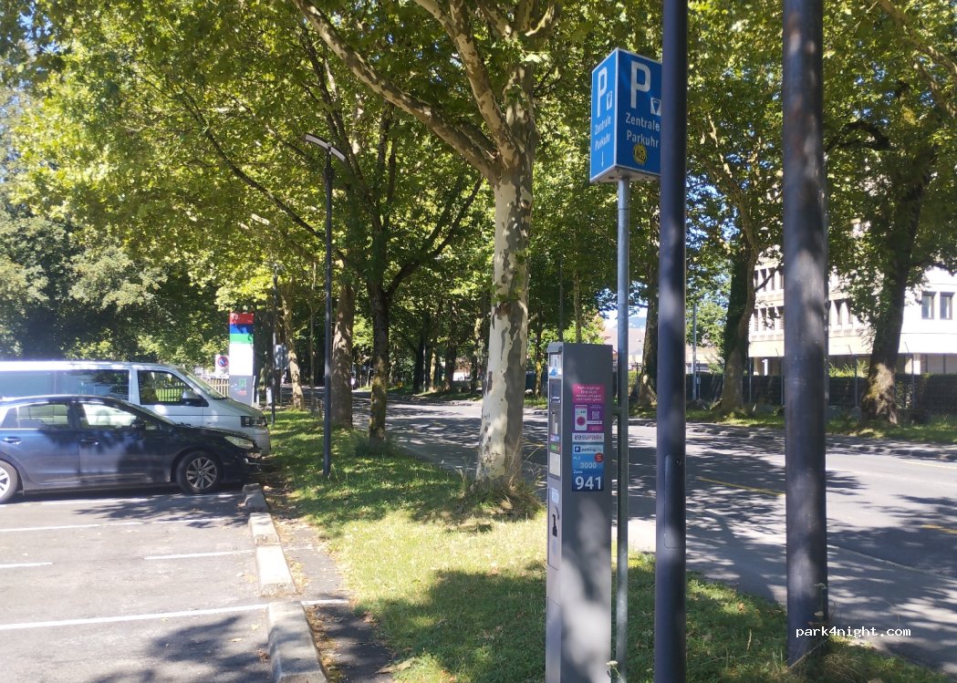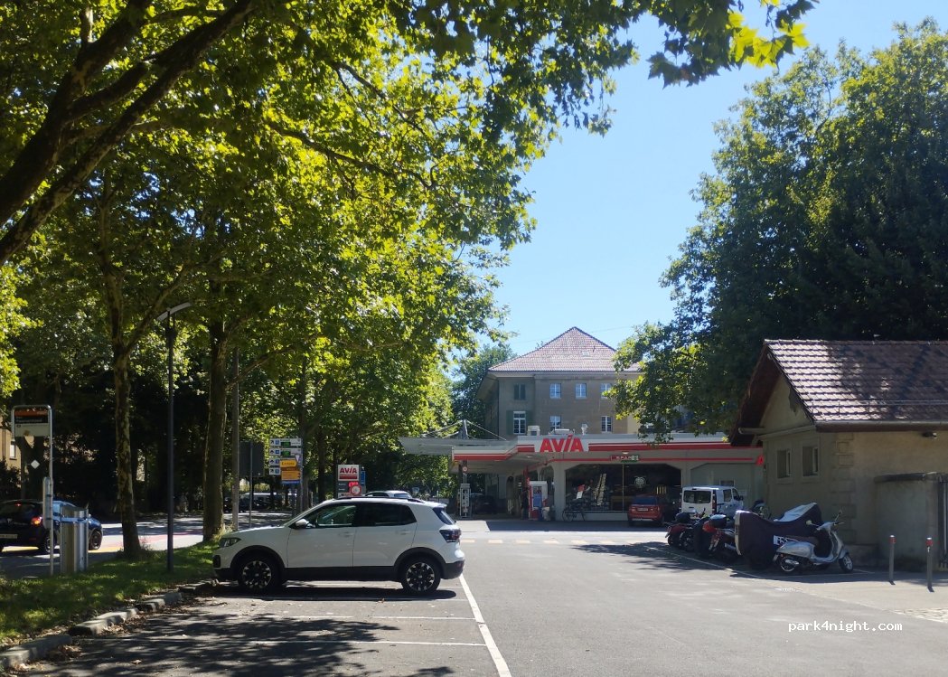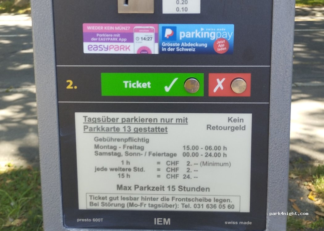 Possibilità di sosta solo dalle 15 alle 6, pagando anche tramite app 3CHf all'ora. Zona tranquilla, con strada principale a lato. Perfetta per visitare la città.