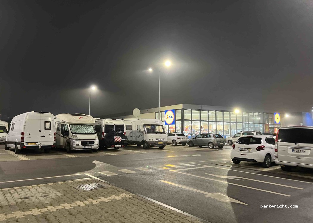 LIDL parking, unlike other nearby ones, does not close at night, very quiet and with other campers for the night. It seemed much quieter and safer than other nearby parking lots reported in the app