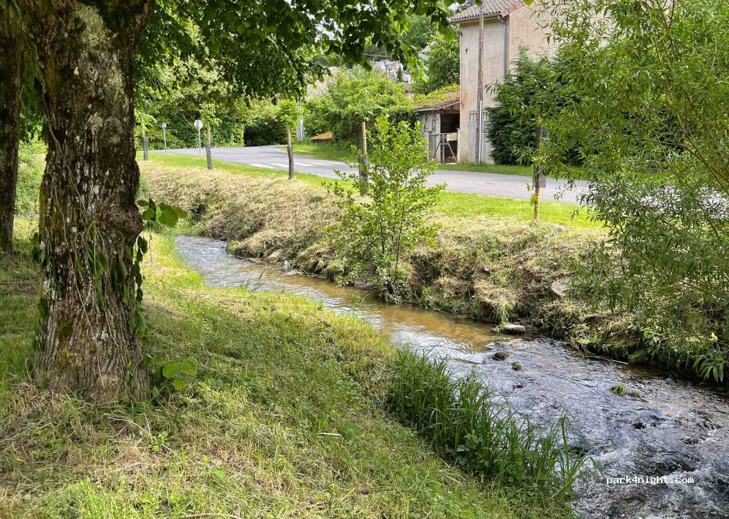 Aparcamiento pequeño y vehículo largo porque hay un lugar junto al río en el centro de este pequeño pueblo medieval. Cerca pasa una calle pequeña pero con muy poco tráfico excepto los residentes locales. Este aparcamiento tiene el mérito de ser sombreado y tranquilo. Tiendas en el pueblo muy bonito.