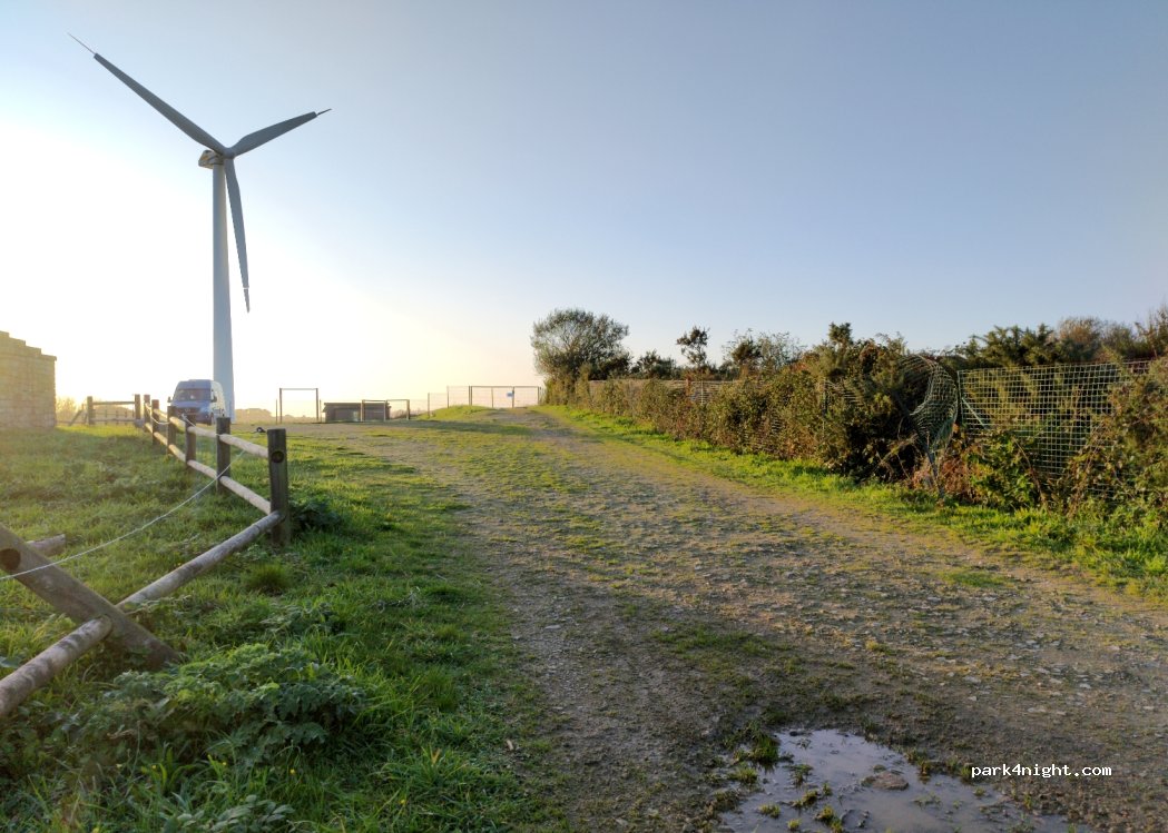 Un petit parking sur un site mégalithique millénaire pollué par une horrible éolienne, juste scandaleux.