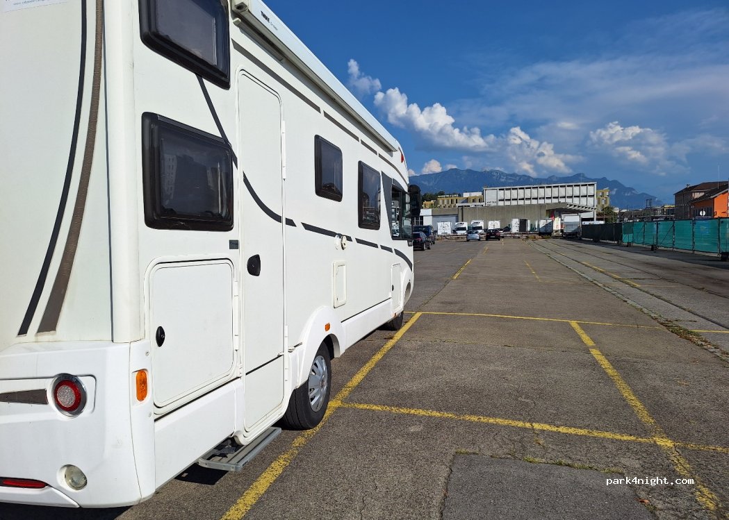 Very large flat parking lot, roadside 5 minutes by bike from the city center, supermarket nearby. Paying for the day from 8:00 a.m. to 10:00 p.m., 5 hours max, chargeable, no ban on sleeping there.