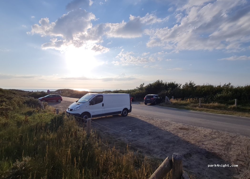 Kleiner Wildparkplatz direkt am Strand, ideal für Spaziergänge mit Hund. Für Kastenwagen und Wohnmobil nicht zu groß. Nachts verboten. Edit: Der Parkplatz ist jetzt für Wohnmobile verboten und hat ein Tor an der Einfahrt (Tor <2m, das an den Tagen etwas zufällig geöffnet oder geschlossen wird). Spaziergänge in den Dünen und am Strand (Fahrräder verboten), einige Bunker am Strand zu besichtigen.