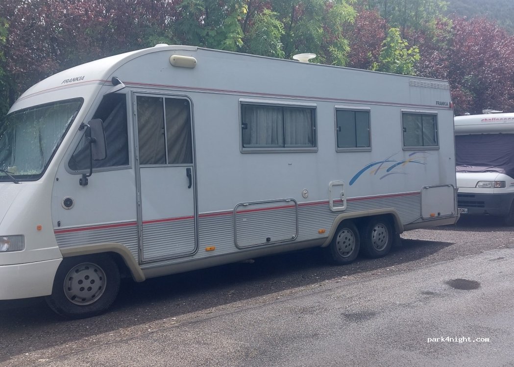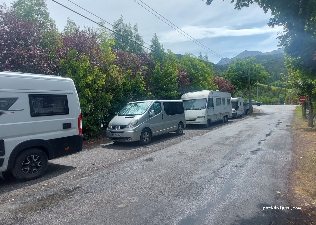 Dans une rue, au bord du terrain de tenis. nous sommes 3 camping car et un fourgon aujourd'hui, le miens fait 7,60m et passe sans problème. Pas trop bruyant, et une nuit paisible.
