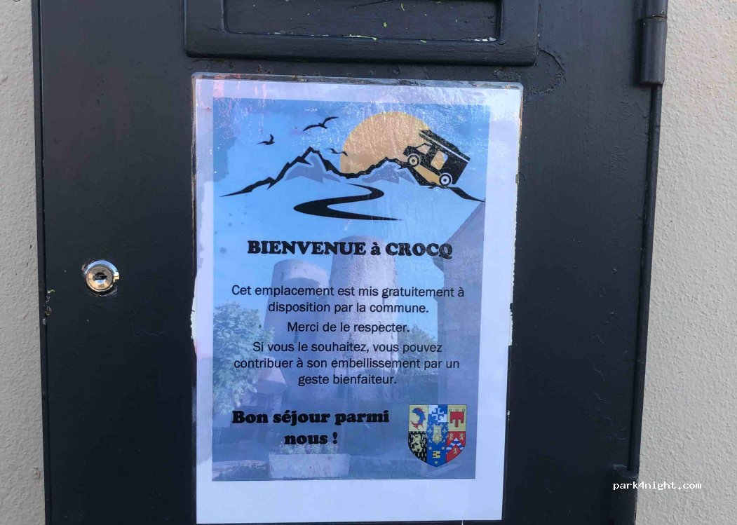 Nous venons d'y passer une nuit calme et tranquille. Tout est gratuit. Les toilettes sont propres avec papier toilette. Supérette casino en face. Nous étions tout seul donc à plat. merci à la mairie de Crocq!!!!
